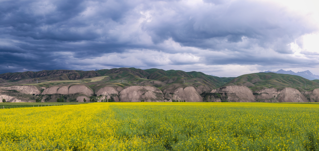 夏天的昭苏,天蓝地广,开满大片大片灿烂的油菜花,仿佛天幕上绘就的一幅巨大的油画。
