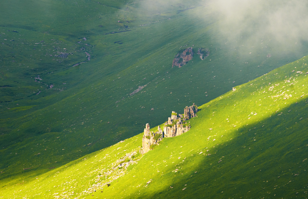 这里同样是云杉的王国,树冠须发皆张,高耸如剑,直顶苍穹。穹顶之下,随处可见的辽阔草原,墨绿色渗透进无边之中,山间牛羊成群,这才是草原。