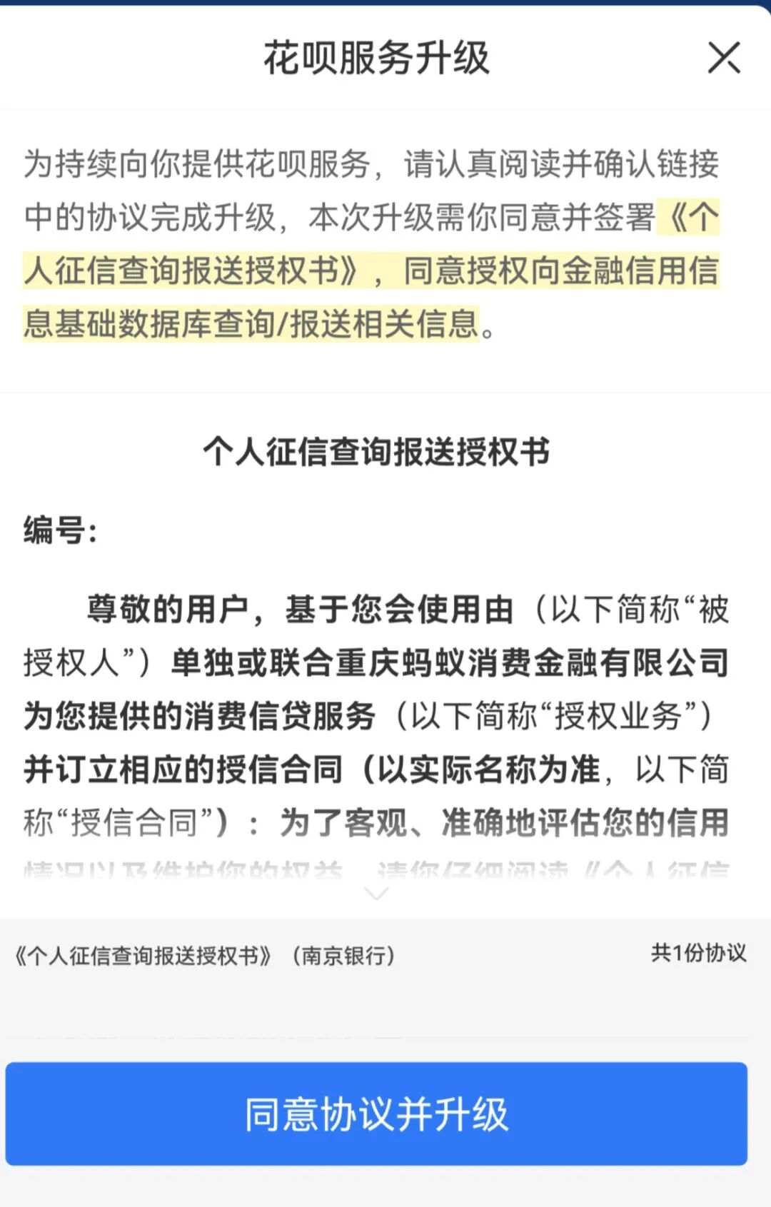 看一下关键字是:逐步,有序的推进,所以,我相信可能很多朋友的支付宝之前就会有提示了,现在被逐步推进到的用户,只要打开支付宝的花呗主页就会有一个提示:为持续向用户提供花呗服务,本次升级需要用户同意并签署《个人征信查询报送授权书》,同意授权向金融信用信息基础数据库查询 / 报送相关信息。。当然了,可能有的同学之前不小心就点击同意了,那之前同意过的,就不会再提示了。