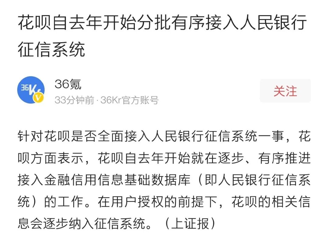 今天给大家说一件与大家可能都有关的大事,那就是我前天看新闻说:针对花呗是否全面接入人民银行征信系统一事,花呗方面表示,花呗自去年开始就在逐步的推进接入金融信用信息基础数据库了,也就是征信系统。