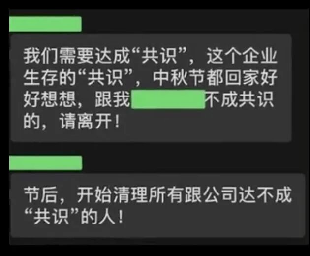领导还让员工在中秋节假期的时候都在家里好好想一想,如果达不成共识,就要被公司清理。