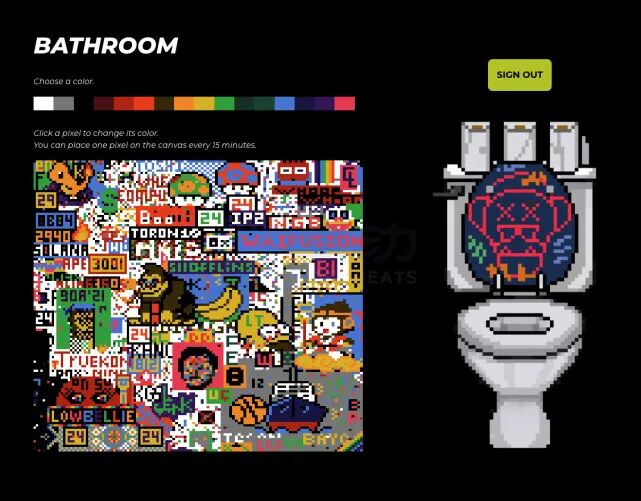 故事发生在十年后,每一个投身于加密领域的猿猴们都将会财富自由,但是那时所有流动性挖矿都已无矿可挖,于是猿猴们开始变得无聊起来。那么猿猴们每天都在干什么呢?他们四人给出的回答是:在沼泽地的一个秘密俱乐部里与猿猴伙伴们一起玩耍。而他们四人为这些财富自由猴设计的娱乐方式,便是「在 Bored Ape Yacht Club Bathroom 的墙壁上涂鸦」。每一个猿猴 NFT 的持有者都可以在画布上随心所欲地画画,每隔 15 分钟便可绘制一个像素点。