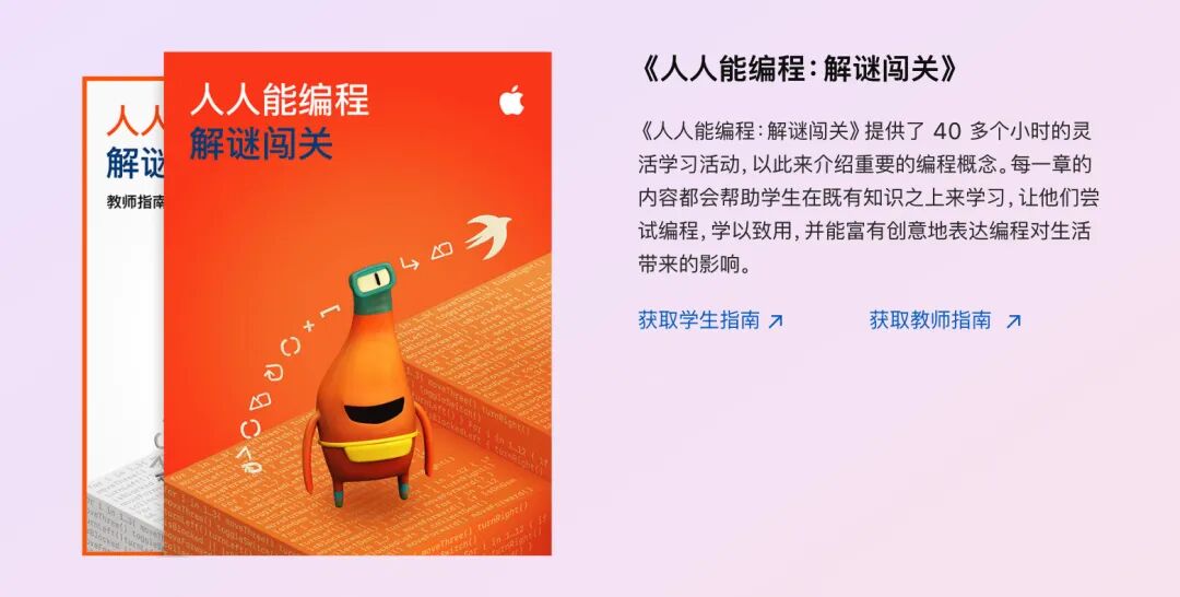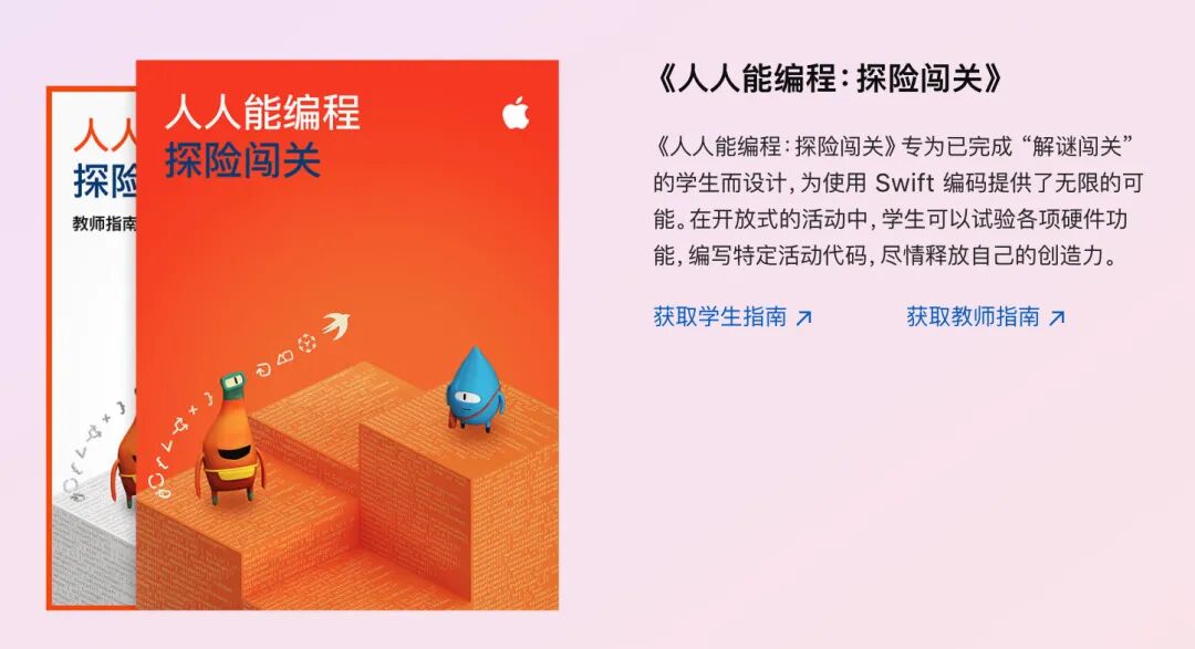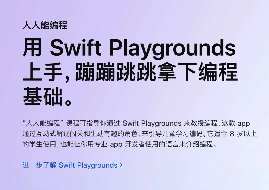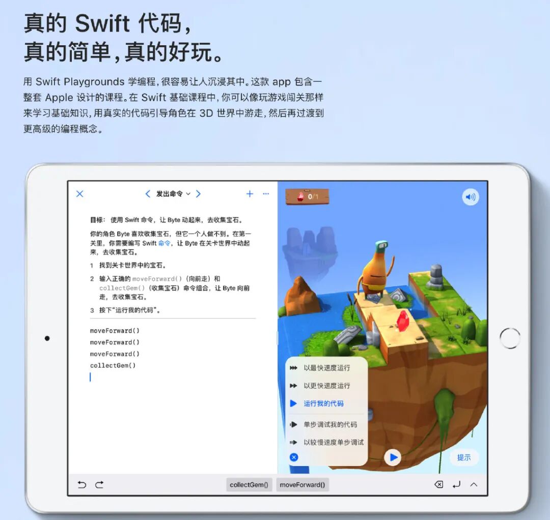我看到这条新闻之后,还专门去苹果官网看了看。目前,根据苹果官网的提供的信息, “人人能编程” 课程可指导你通过 Swift Playgrounds 来教授编程,这款 App 通过互动式解谜闯关和生动有趣的角色,来引导儿童学习编码。它适合 8 岁以上的学生使用,也能让你用专业 App 开发者使用的语言来介绍编程。