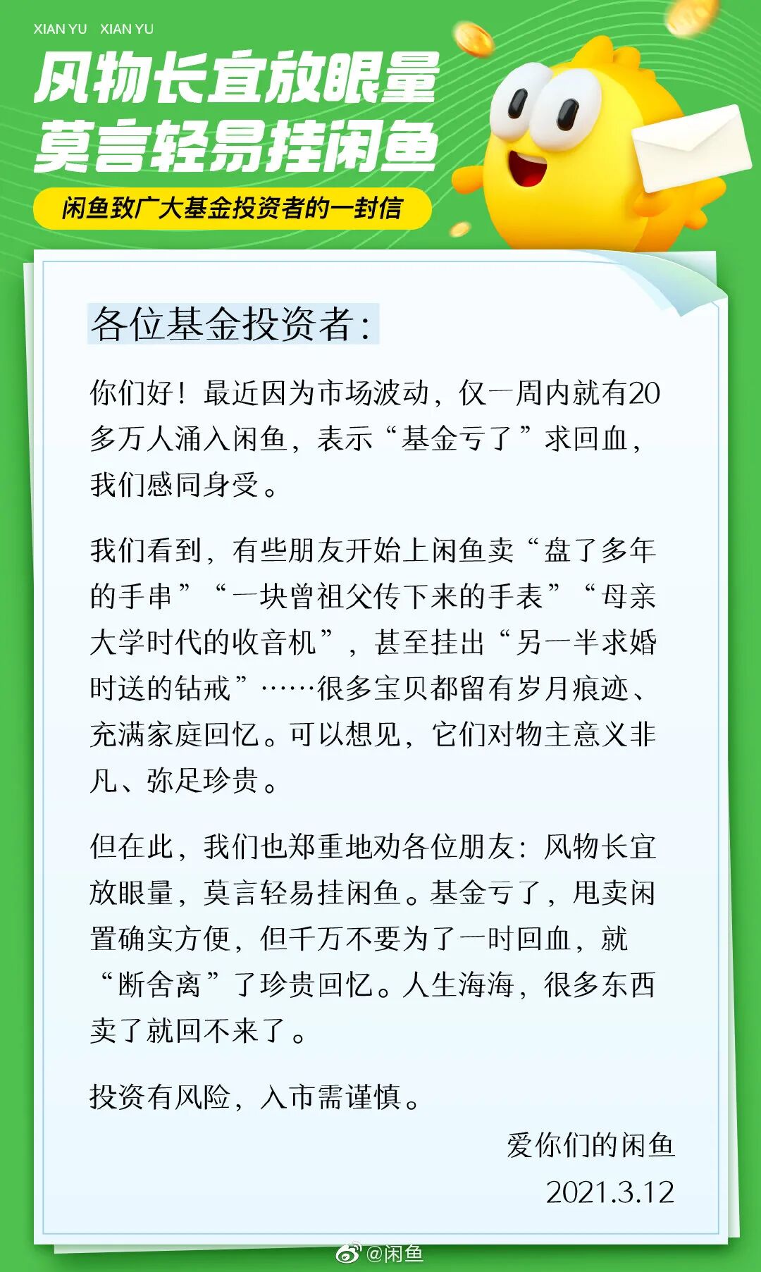 闲鱼发这封信的意思是让大家「风物长宜放眼量」。
