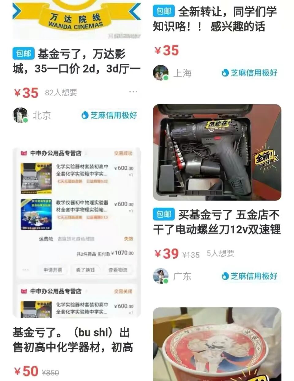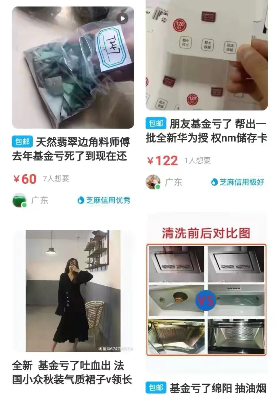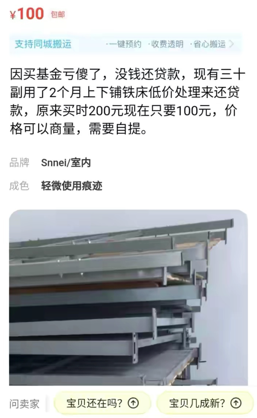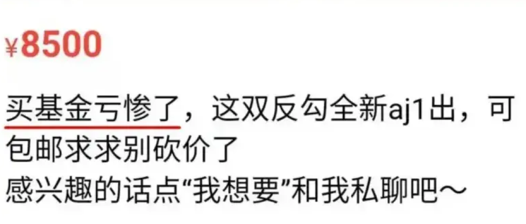 所谓贫穷限制不了年轻人的想象是因为他们被基金套牢之后,开始想办法挣钱了。比如:在闲鱼上不少闲置商品的卖货开场白,变成了“买基金亏了”,而转卖的东西,大到电脑、手机、皮草,小到各种优惠券。