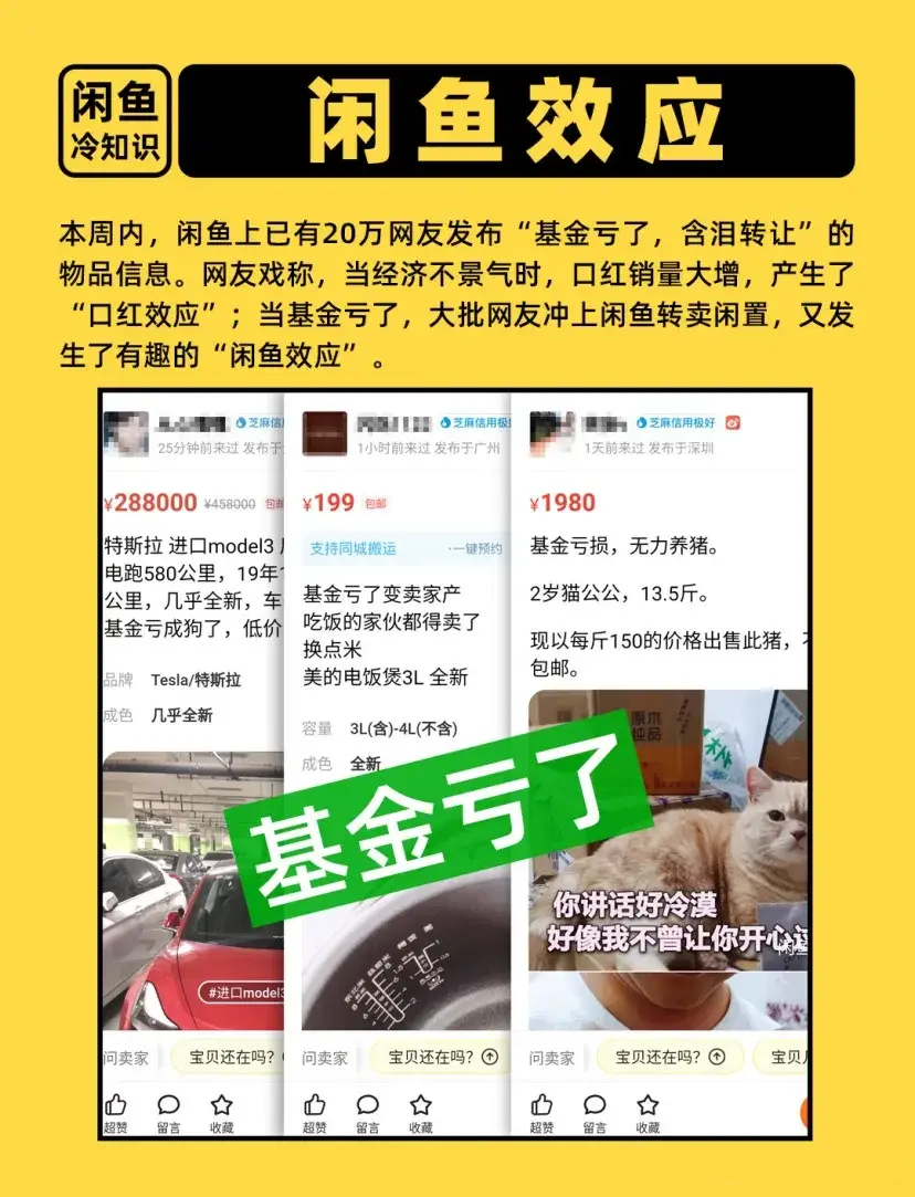 这就引发了所谓的「闲鱼效应」。何为闲鱼效应呢,就是当基金亏了,引发大批网友冲上闲鱼转卖闲置的现象。与之对应的是「口红效应」。