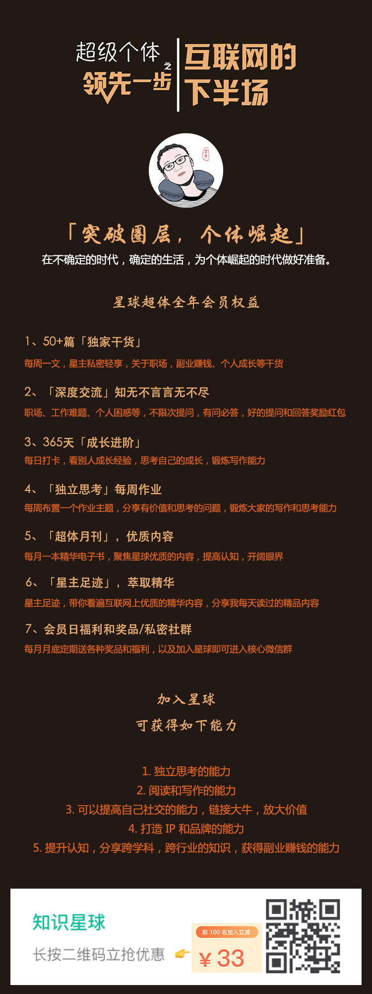 最后推荐一下我的知识星球「突破圈层,个体崛起」,现在加入可以优惠 33 元,目前仅限 30 个名额。具体权限,请看下图。