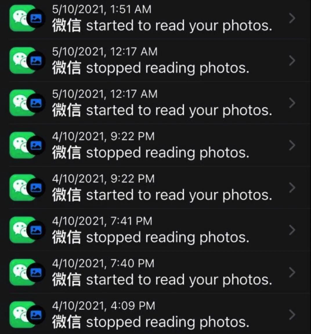 而且,同时就在美团被爆料不断获取定位之前,微信也被爆出了微信后台数次读取用户相册,每次长达 1 分钟,都是采用同样的测试方式,该网友开启了 iOS 15 的隐私新特性 “记录 App 活动”,对所有 App 的隐私读取行为进行 7 天的监控,并使用 App Privacy Insights 对记录进行读取。