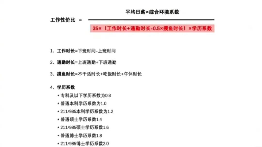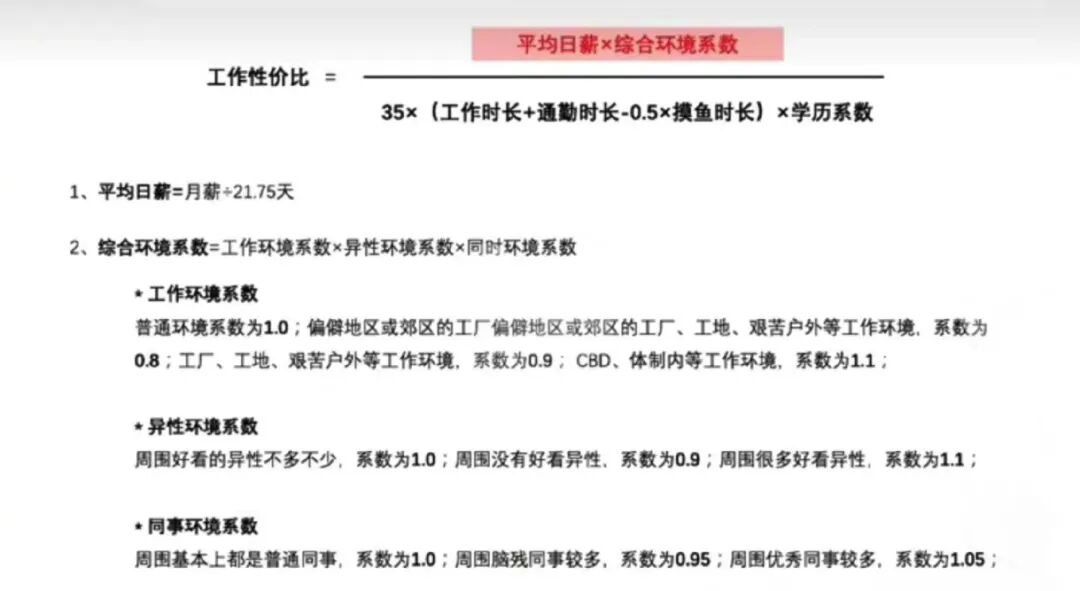 这工作性价比公式,就目前来看,包含的要素其实挺多的,比如:包含了工作环境,异性环境,同事环境等,还包含了学历情况,同时更包含了:工作时长,通勤时长,以及摸鱼时长。