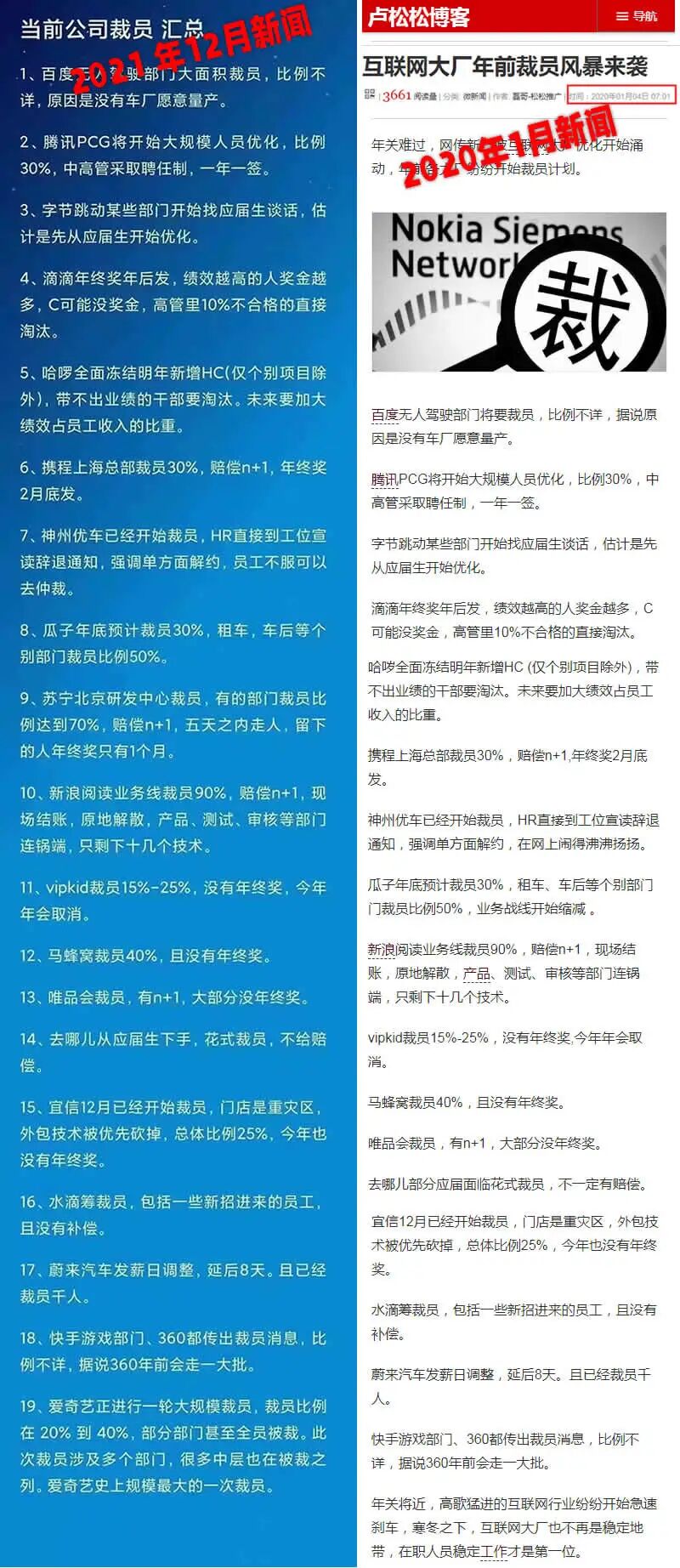 完全没必要吓自己。而且,我看到最近互联网上又在盛传一张各大互联网公司裁员的图片,上面列举了很多公司,裁员情况触目惊心,但是,你只要稍微注意一下,你就会发现:去年也是在传这张图。