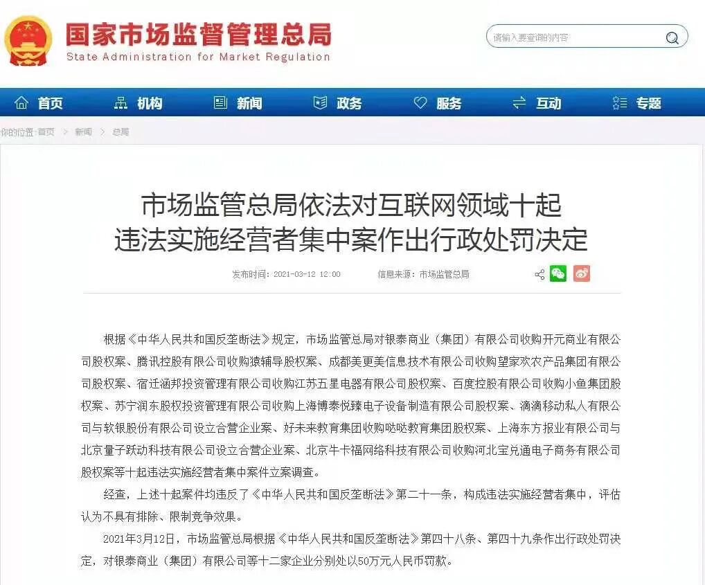 3 月 12 日,市场监管总局根据《中华人民共和国反垄断法》第四十八条、第四十九条作出行政处罚决定,对银泰商业(集团)有限公司等十二家企业分别处以 50 万元人民币罚款。十起案件均违反了《中华人民共和国反垄断法》第二十一条,构成违法实施经营者集中,评估认为不具有排除、限制竞争效果。