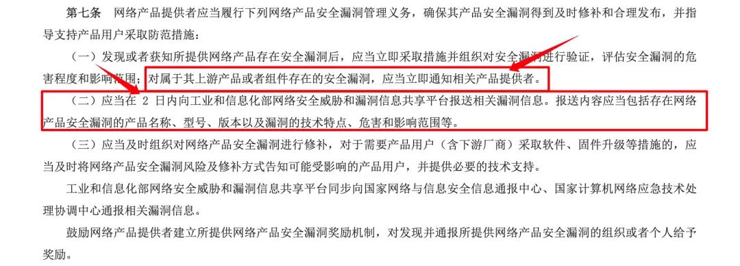你看,规定写的是:当发现安全漏洞的时候,要第一时间上报给产品提供者,然后是 2 日内上报给工信部网络安全威胁和漏洞信息共享平台。