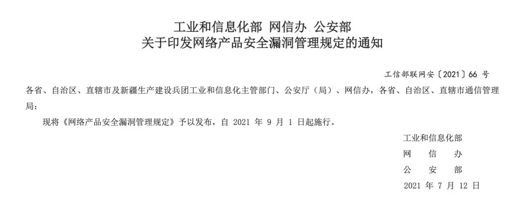 原因很简单,在 2021 年 7 月 12 日,工信部、网信办和公安部联合下发的《关于印发网络产品安全漏洞管理规定的通知》中就做出过明确的规定。