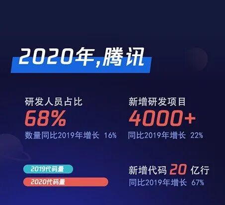 昨天腾讯对外发布 2020 年度《腾讯研发大数据报告》,报告显示:2020 年腾讯研发人员占公司总人数的 68%,同比 2019 年增长 16%。