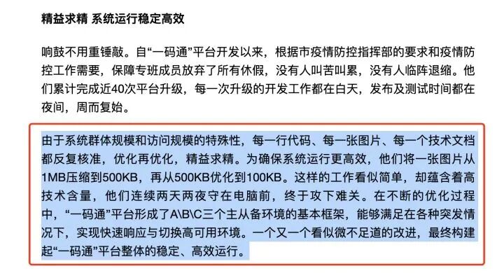 由于系统群体规模和访问规模的特殊性,每一行代码、每一张图片、每一个技术文档都反复核准,优化再优化,精益求精。为确保系统运行更高效,他们将一张图片从 1MB 压缩到 500KB,再从 500KB 优化到 100KB。这样的工作看似简单,却蕴含着高技术含量,他们连续两天两夜守在电脑前,终于攻下难关。在不断的优化过程中,“一码通” 平台形成了 A\B\C 三个主从备环境的基本框架,能够满足在各种突发情况下,实现快速响应与切换高可用环境。一个又一个看似微不足道的改进,最终构建起 “一码通” 平台整体的稳定、高效运行。