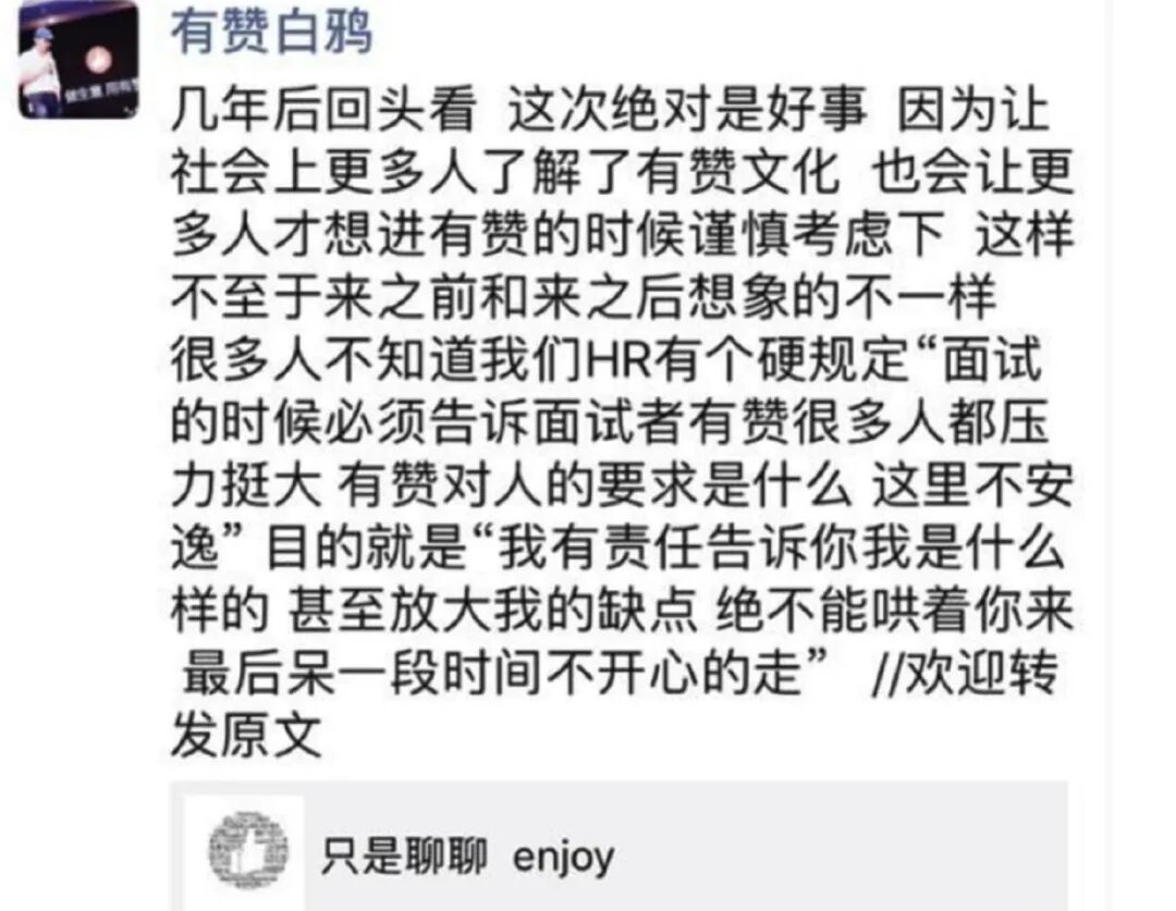 而且有赞 CEO 白鸦在朋友圈回应公司 “996” 工作制称:“几年后回头看,这次绝对是好事,因为让社会上更多人了解了有赞的文化”。