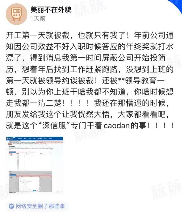 事情是这样的, 有人在脉脉上爆料说:自己开工第一天就被裁了,原因就是由于公司年终奖打水漂了,自己想赶紧找工作跑路,所以打开招聘网站,准备投简历。没想到被公司的上网管理系统监控了。
