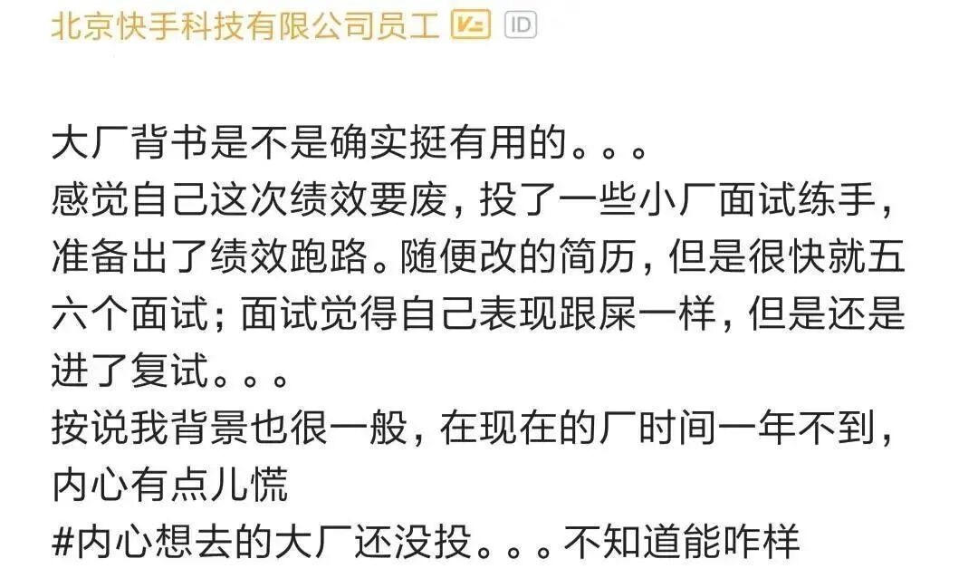 事情大概是这样的,一个快手程序员在某职场 App 吐槽爆料:感觉自己绩效差,可能药丸,准备跑路,投了一些小厂面试练手,随便改的简历,居然很快就受到五六个面试邀请,面试时表现的像屎一样,依然进了复试,这说明有大厂背书确实挺有用的。