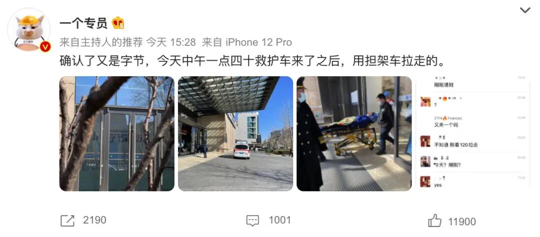 但是,就在同一天 ,23 日下午,字节跳动,又上了微博热搜。当天下午 1 时 40 分左右,疑似字节跳动员工爆料又有员工被送往医院。网传聊天记录显示,在字节跳动公司楼下有疑似该公司员工被救护人员用担架抬走。