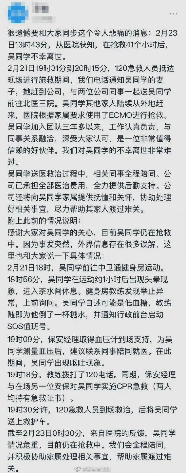 一名自称字节跳动员工妻子的网友爆料,28 岁的老公在公司猝死,自己怀有 2 个月身孕。事发后一名知情人在#字节跳动内网辟谣员工猝死#,截至 23 日 0 时 30 分,该员工吴同学情况危重,目前仍在抢救中。21 日 18 时,吴同学前往中卫通健身房运动,约一小时后出现头晕,教练上前询问并通知行政前台。随后吴同学出现呕吐现象。19 时 18 分,教练拨打 120。19 时 30 分许,120 急救人员到场救治后将其送医。2 月 23 日 13 时 43 分,从医院获知,在抢救 41 个小时后,吴同学不幸离世。