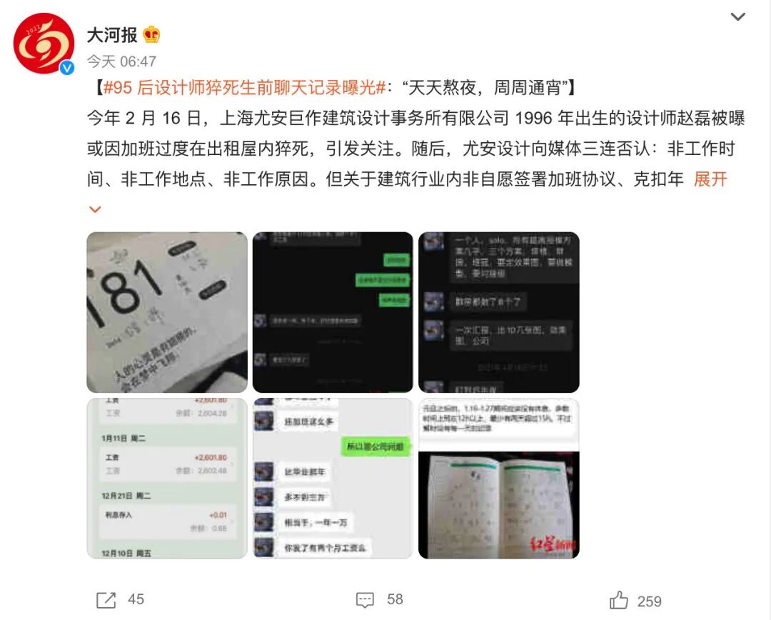 昨天,在微博热搜上有两条关于加班猝死的新闻,一条是:#95 后设计师猝死生前聊天记录曝光# 。