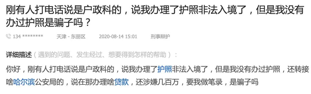然后,我越听越不对,我听我对象跟电话那头(冒充公检法)说:什么北京市公安局户政科打电话说,有人用我的身份证号在哈尔滨办理了一个护照非法入境!让我打电话联系你这边核实注销。