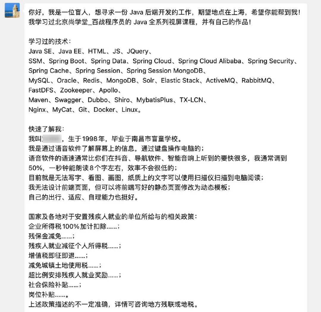 昨天有个叫「七分帅气」的读者,加了我的微信,连续加了四次,备注是:你好,我是一位盲人,想寻求一份 Java 后端开发的工作,期望地点在上海,希望你能帮到我!
