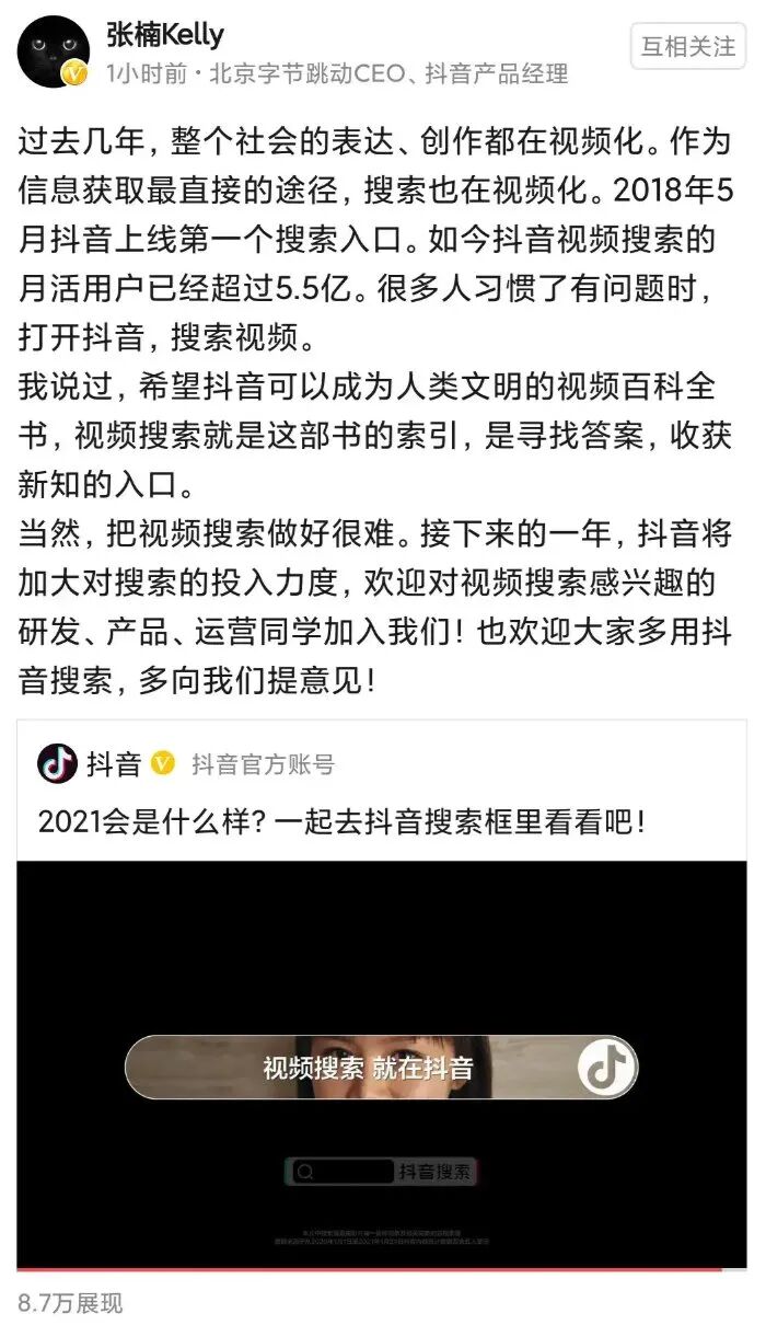 张楠说:希望抖音成为人类文明的视频百科全书,视频搜索就是这部书的索引。