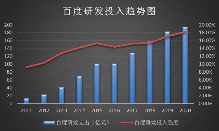 如果从 2015 年 - 2017 的 3 年投入 300 亿,而此后的从 2018 年到 2019 年,投入研发占比分别是 14% 和 16%,到了 2020 年,研发投入则从预估的 16% 暴涨到 21.4%。那么按照年收入 1000 亿来粗估,过去 10 年,百度的研发支出就超过了 1000 亿元。平均一年研发投入 100 亿。