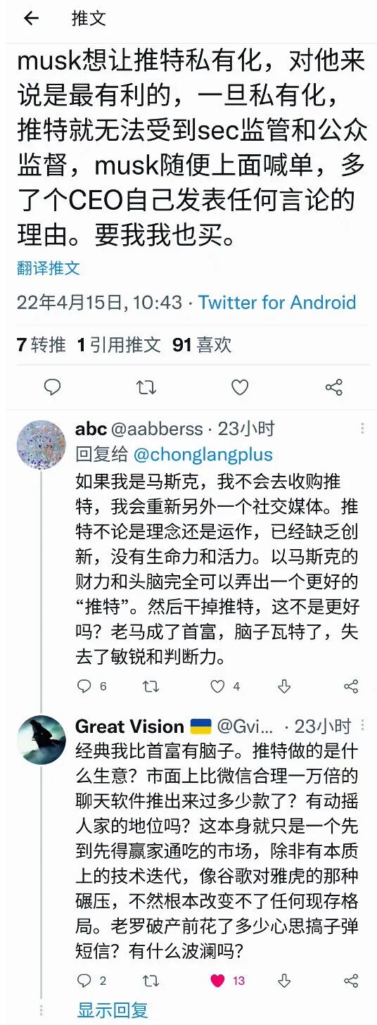 马斯克最近跟 Twitter 干上了,说实话,我到现在也没有弄明白为什么马斯克想要私有化 Twitter ,Twitter 对马斯克目前做的业务有啥交集吗?看起来与电动汽车特斯拉,与火箭发射 Space X ,与太阳城项目好像都是八竿子打不着啊。