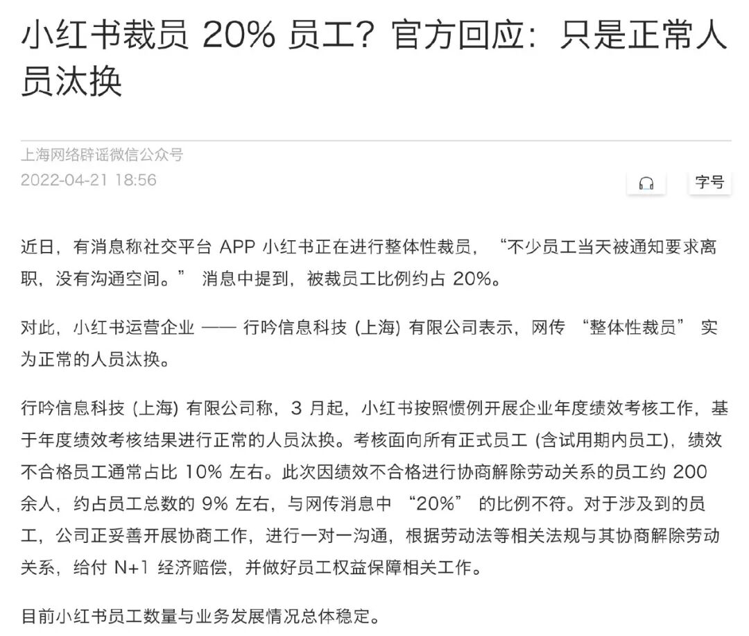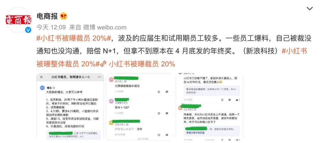 昨天小红书登上了微博热搜,不少小红书员工在脉脉上爆料,当天突然被通知 last day,只有通知,没有沟通的空间,赔偿方式是 N+1,但拿不到年终奖 —— 小红书一般每年 4 月底发绩效年终奖。有小红书员工透露,此次整体裁员 20%,各个部门都有波及。