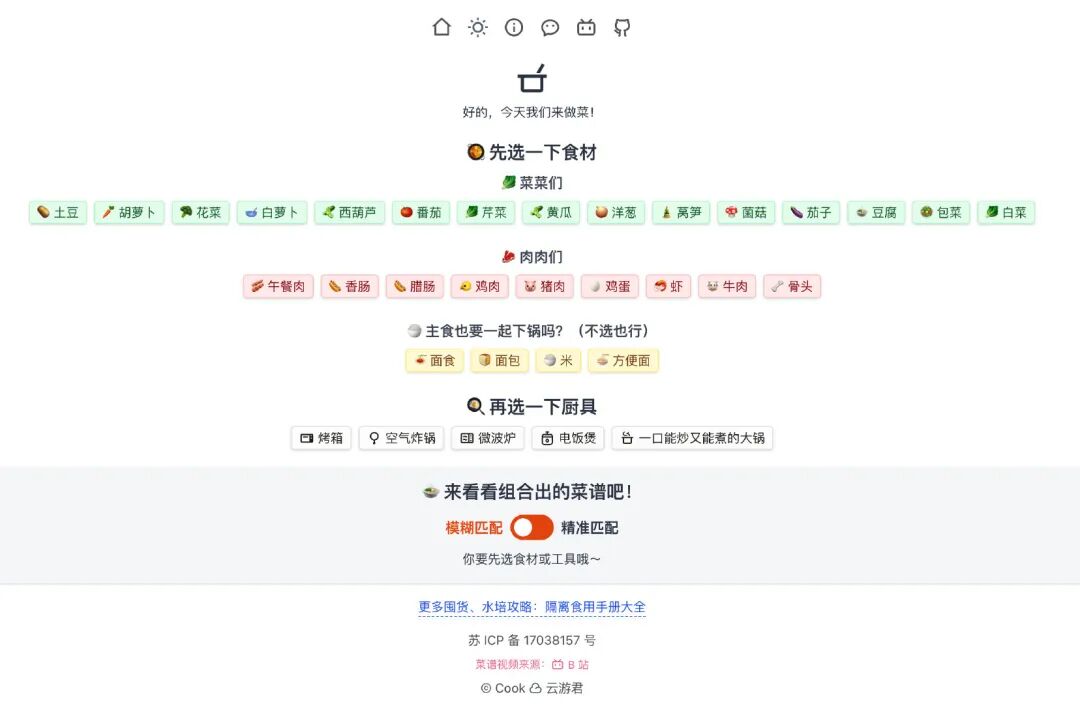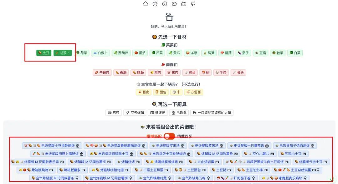这个小网站设计的很有意思,可以根据你挑选的食材帮你列举可以做什么样的菜,比如:我挑选土豆和胡萝卜,你会出现以下做菜的组合。