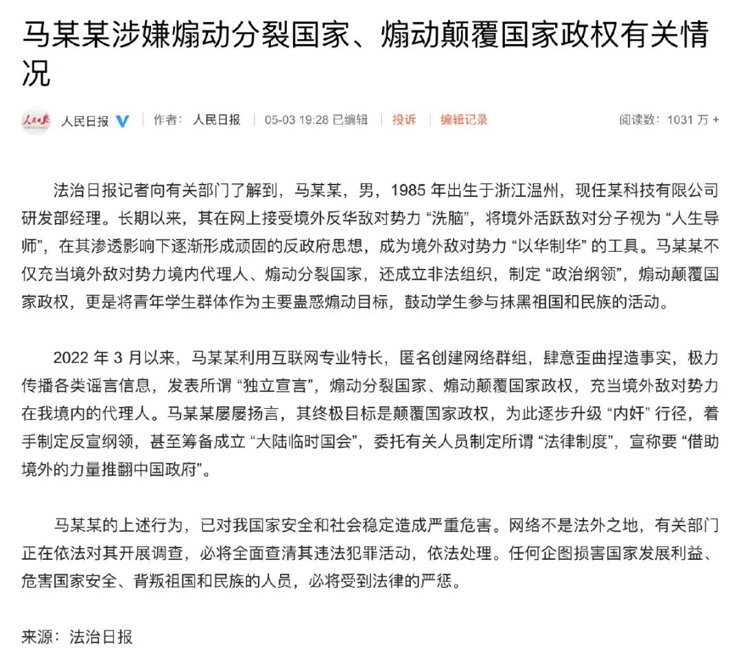 今天晚上,人民日报发文披露了马某某的相关身份信息。具体如下: