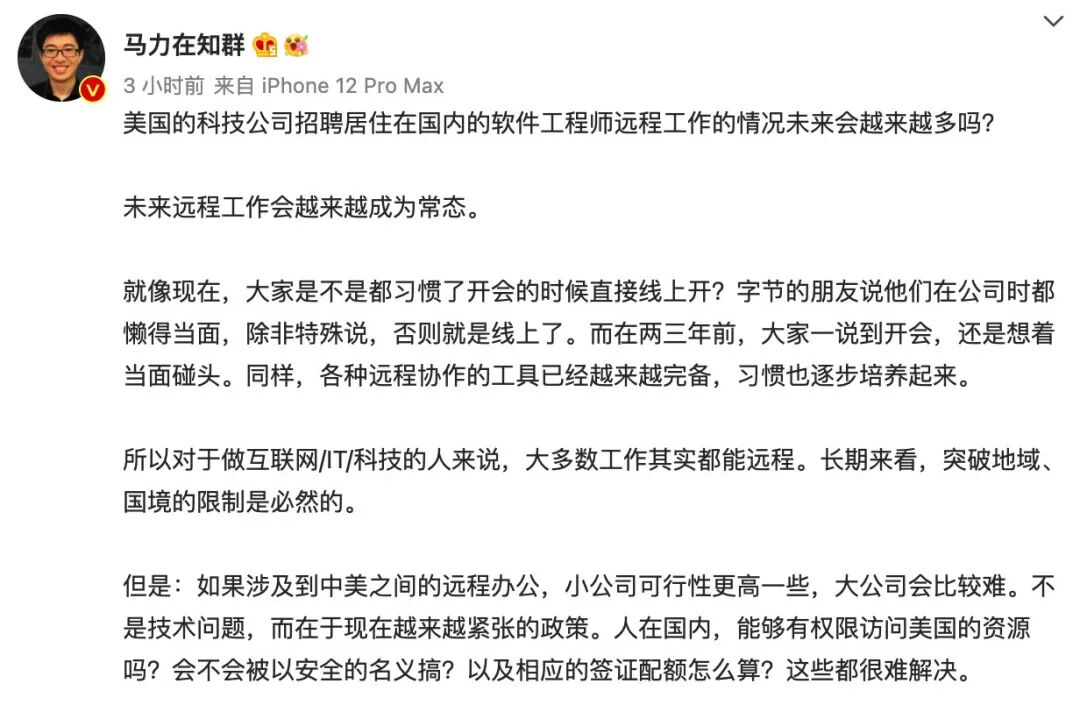 首先,我们都知道美国的科技公司都在远程公司,而且前一段时间,美国的民宿平台爱彼迎 aribnb 这家公司,宣布允许员工永久远程办公,而且远程办公待遇不变,什么意思呢?就是不管你在哪里办公,并不是根据你的办公地点和生活的消费水平的高低而调整薪资,你去马尔代夫旅游度假,边度假,边工作,都不会调整薪资,保持不变。