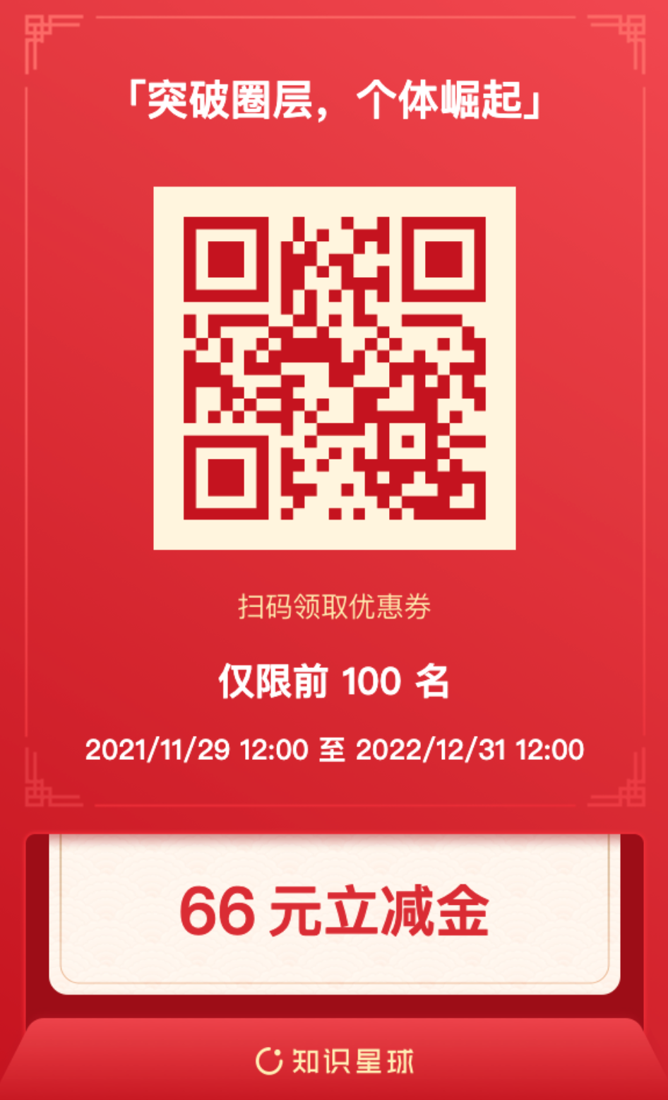 我的知识星球「突破圈层,个体崛起」正在搞活动,可以现在加入,之前有人说我的价格太贵了,现在我调低了价格,将 199 元,调成了 166 元,另外,再赠送一张 66 元的优惠券,仅限前 100 个哈,相当于 100 元就可以加入。加入即可领取星球内我整理集结的所有 PDF 版电子书,包括今天整理的。
