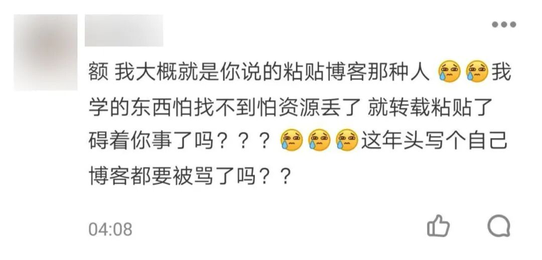 如果你复制粘贴博客,是为了收藏,那么是否可以将原文收藏到你的知识管理软件当中,亦或者将你自己写的这种文章,改成仅自己可见呢?