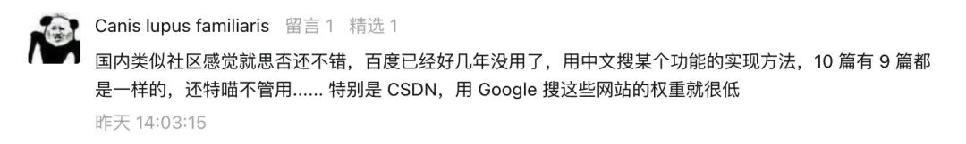 但是,让我没想到的是,大家都在吐槽 CSDN ,说开发者搜索引擎要是不收录 CSDN 就更好啦。