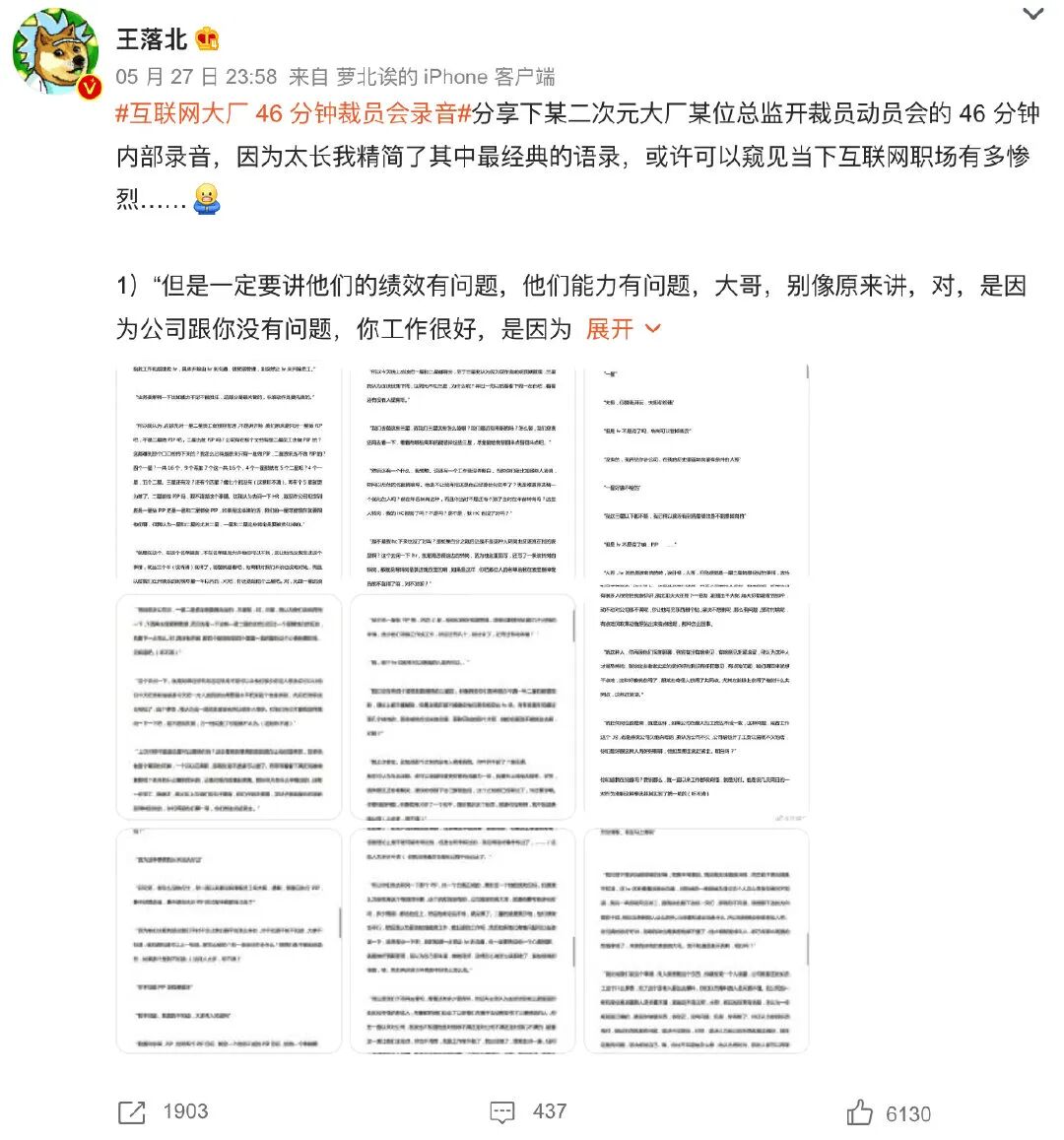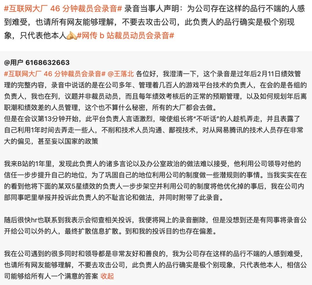 昨天微博上知名的职场博主曝光了一条某站的消息,网上曝光了 46 分钟的裁员会录音。