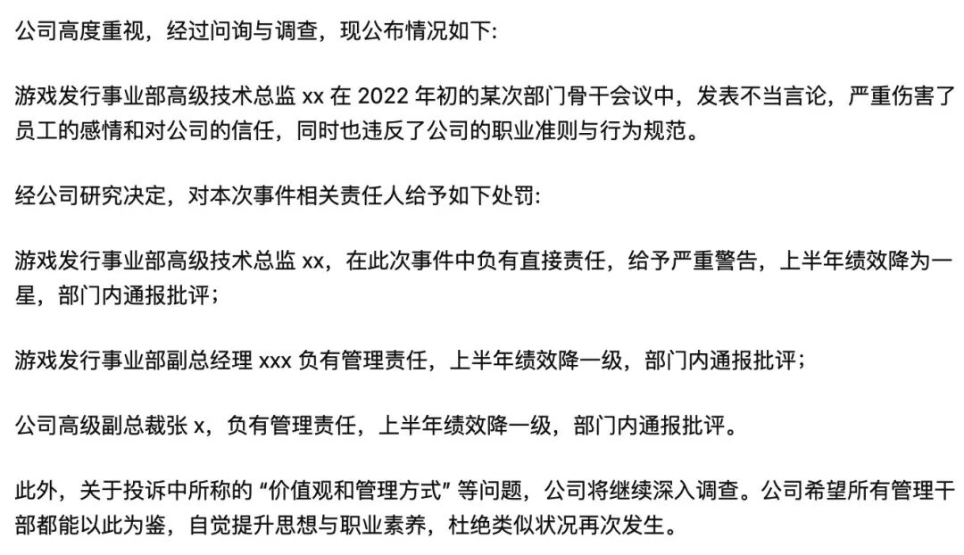 当事人回应此事件,表示:该录音为年后 2 月绩效管理的内容,录音中说话的是在公司多年、管理着几百人的游戏平台技术的负责人,议题并非裁员动员,而且每年绩效考核后的正常的预期管理,以及如何规划年后离职潮和绩效差的人员管理。为公司存在这样的品行不端的人感到难受,也请所有网友能够理解,不要去攻击公司,此负责人的品行确实是极个别现象,只代表他本人。