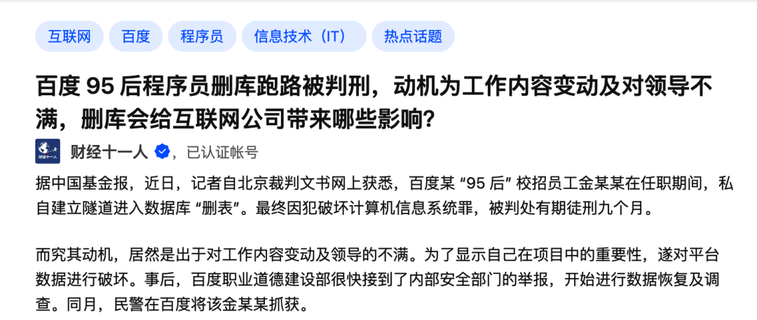 昨天,看到一条新闻,在北京裁判文书网上显示,百度某 “95 后” 校招员工金某某在任职期间,私自建立隧道进入数据库 “删表”。最终因犯破坏计算机信息系统罪,被判处有期徒刑九个月。