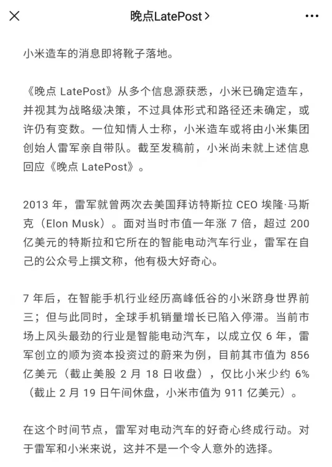 而与此同时,就在昨天下午晚点团队爆料:小米确定要造车了,或有雷军亲自带队,将造车视为战略级决策。