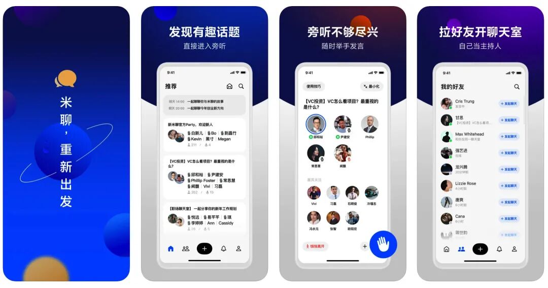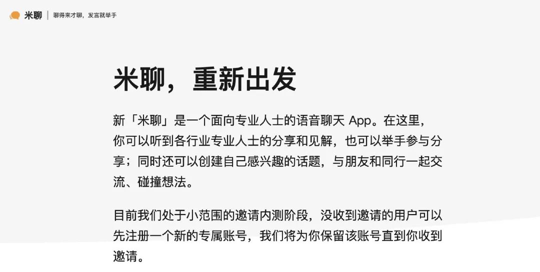 可是不到一周的时间,新米聊正式重新上线,同时定位为面向专业人士的语音聊天 App,对标的是:Clubhouse 。