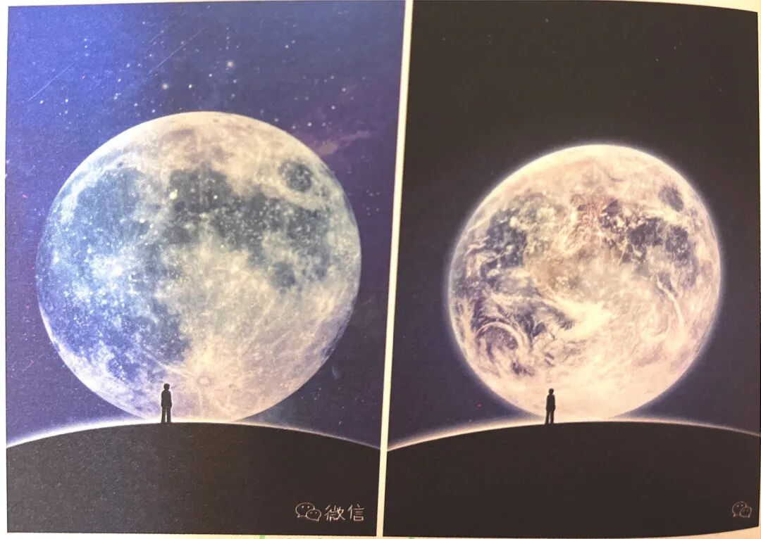 其实,之所以将一个小人从站在地球上看月球改成站在月球上看地球,这样的改变是为了传达「孤独是永恒的主题」。你看,一个人都离开地球了,在月球上遥望地球就很孤独。
