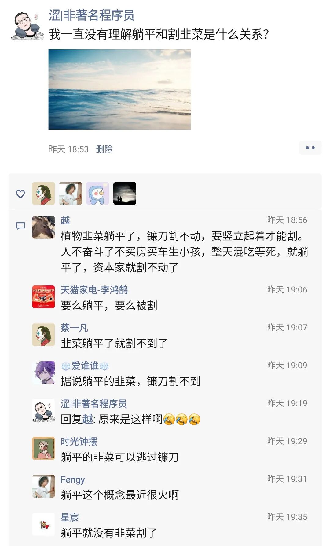 昨天我发了一个朋友圈,问:躺平和割韭菜之间到底是什么关系?