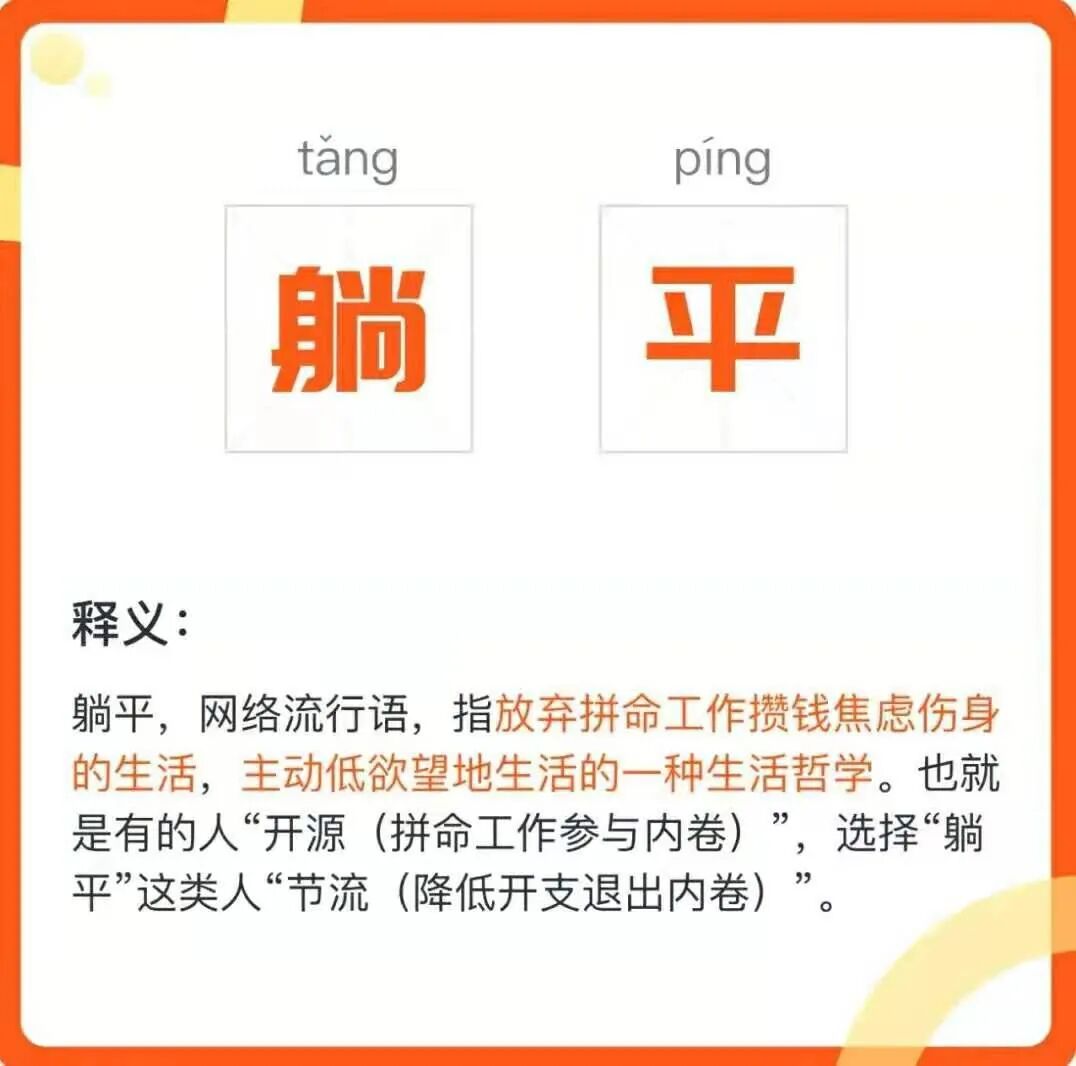 最近躺平这个词语非常火,它最早出现在一篇叫做“躺平即是正义”的帖子里,其作者分享了自己所谓的“躺平”生活。