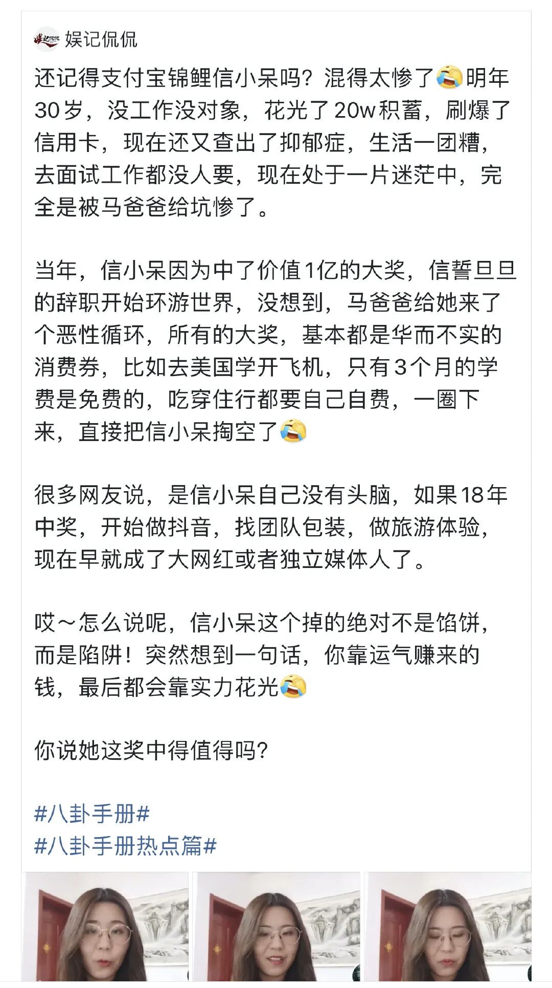 据她在视频里爆料说:自己现在是个过期的支付宝锦鲤,没钱,没工作,花光了 20 万的积蓄,还查出了抑郁症的倾向,现在生活一团糟,面试没人要,非常迷茫。
