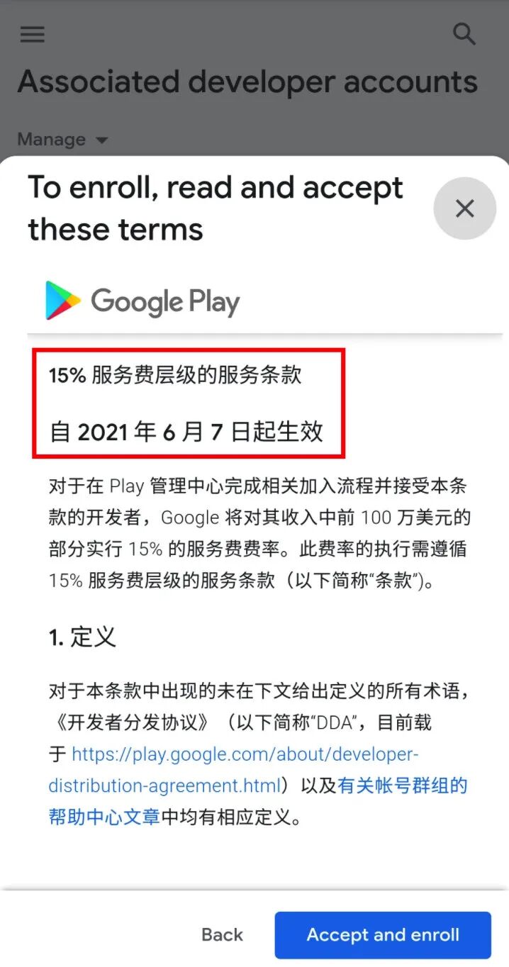 在今年 3 月份的消息是 Google Play 将在 7 月 1 号开始实施新规,将降低 Google Play 的服务收费比例:每个销售数字产品或服务的开发者每年 100 万美元以下收入的服务费率降为 15%。