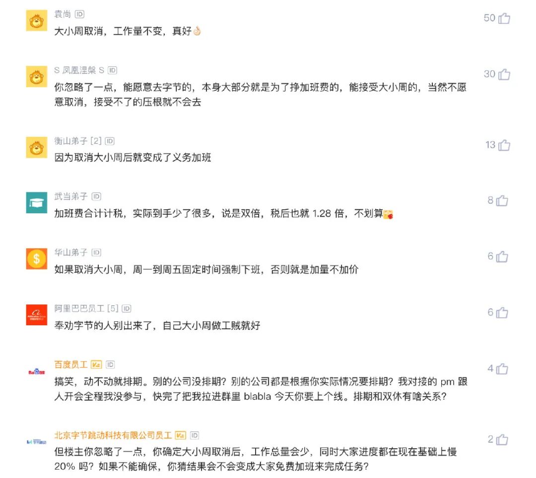 但是,人家支持大小周的员工也有自己的论点,反对取消的员工说得很直白,如果执行双休制,等于少则每年少赚 5 万块钱,多则少赚 10 万块钱的加班费,「不为钱我来字节干嘛?」「工作量不减,还取消大小周,这不等于是在白嫖你吗?」