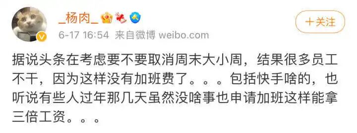 当然了,在没有加班费,实行大小周的公司,要取消大小周,可能就不会遇到字节跳动这样的麻烦了。