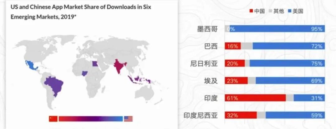 这是 2019 年,中国和美国在六个新兴国家市场的主要 App 市场份额的占比。